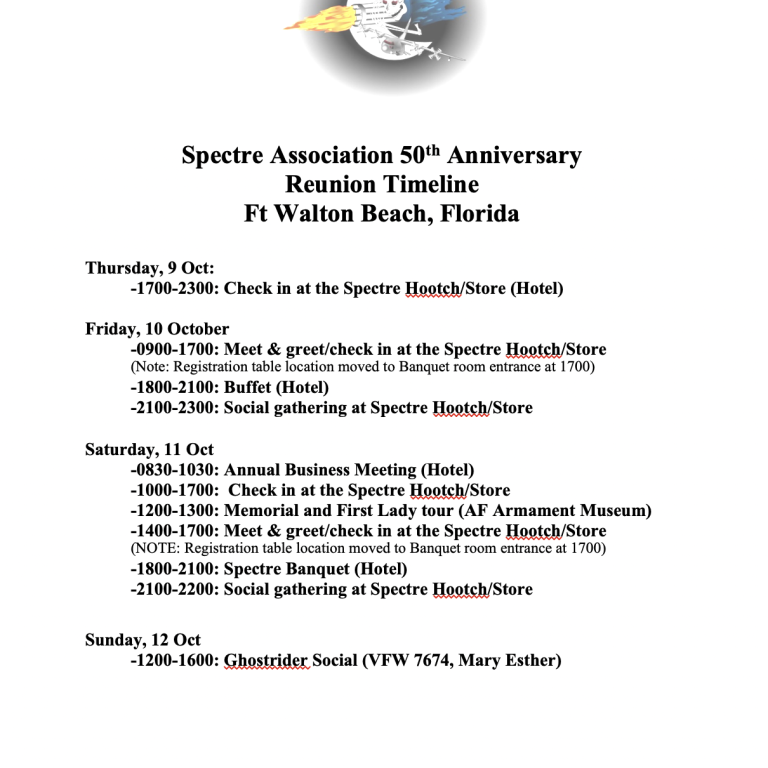 NOTE: You must be a member of the Spectre Association to attend the annual reunion. If you are unsure of membership status, we will confirm membership upon receiving your application.